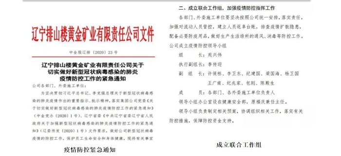 为做好疫情防控这一项重大政治任务,排山楼公司按照“疫情就 是命令,防控就是责任”的要求,以“生命重于泰山”的态度,坚决 快速贯彻落实集团公司党委、辽宁省委省政府有关疫情防控的决策部署和阜新市疫情防控指挥部1号令、2号令的要求采取有力措施, 切实防止疫情扩散蔓延。