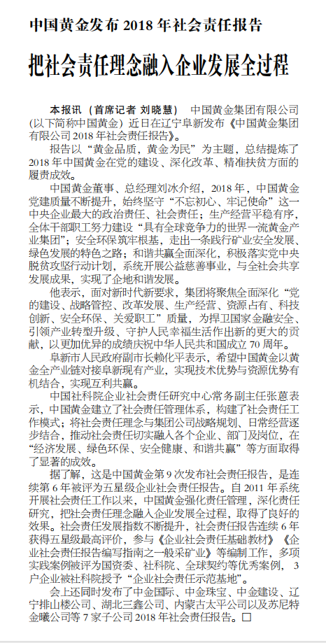 (社会责任报告发布报道)中国矿业报 2019 . 9 . 16 第3935期 中国黄金发布 2018 年社会责任报告 把社会责任理念融入企业发展全过程