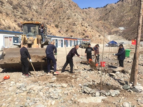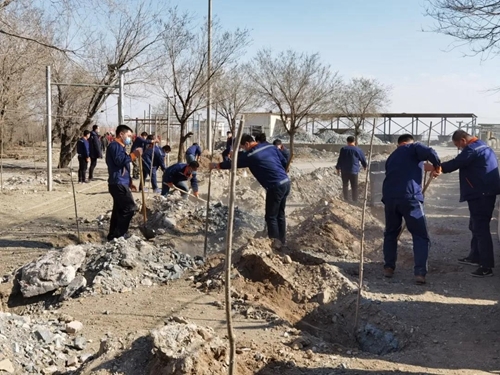 在选冶厂党支部的碎矿车间、干排车间,大家有的挖坑、有的培土、有的浇水、有的栽苗……党员抢着干、干部带头干、群众跟着干,一棵棵树苗扎根沃土,为春日的鑫达增添了盈盈新绿。