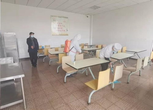 ▲实行分餐制,保持1米以上距离就餐。图为对食堂进行消毒。